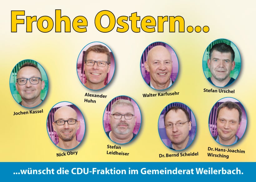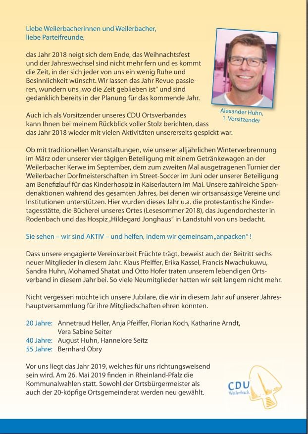 Auf der diesjährigen Mitgliederversammlung des CDU Ortsverbandes Weilerbach wurde Jochen Kassel einstimmig als Kandidat für die Ortsbürgermeisterwahl im Mai 2019 nominiert. Der 45 jährige ist verheiratet, hat zwei Kinder und ist selbständig.